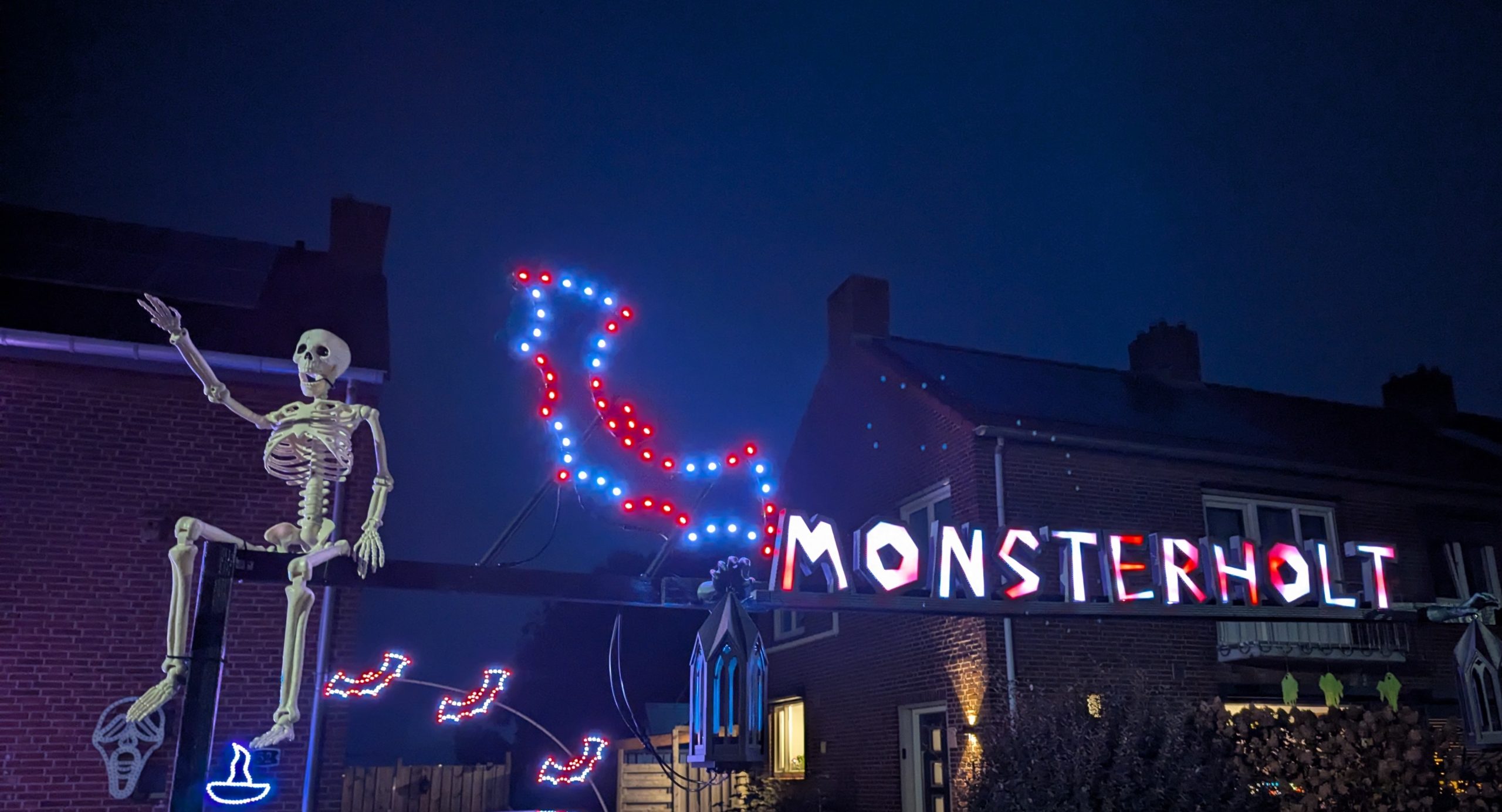 Een gruwelijk gave licht- en geluidshow op Rector van de Boornlaan 52. Natuurlijk op griezelige Halloweenmuziek. Check zeker ook de enge t-t-t-t-t-t-t-t-t-tent op huisnummer 33.