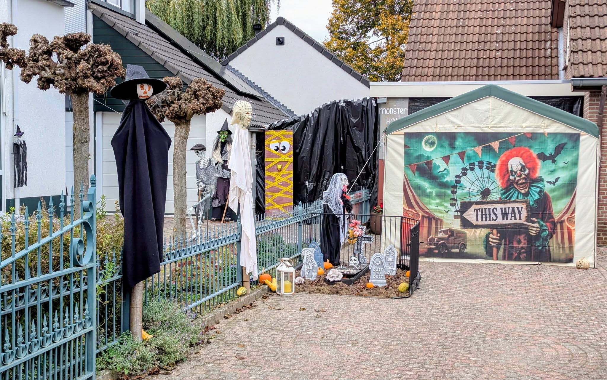 Wij durven deze straat bijna niet meer in. Onder meer scare actors, een brrrrrrr…uidspaar en skeletten die aan de haal gaan met een chemisch goedje (nummers 7 t/m 35) en 2 overdekte griezeltenten (nummers 26 en 28)  en andere monsterlijke creaties (nummers, 49, 51, 53 en 61)